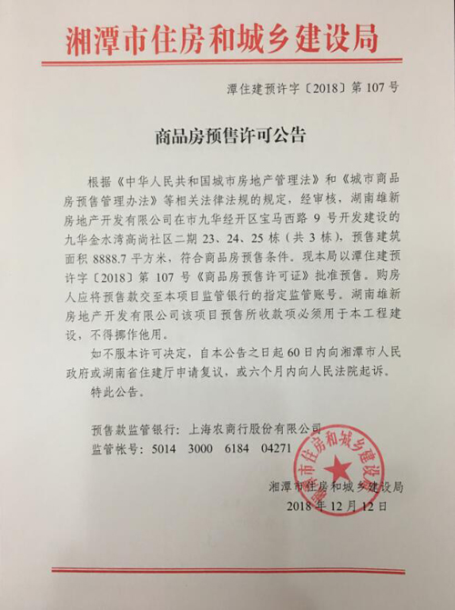 經(jīng)審核,湖南雄新房地產(chǎn)開發(fā)有限公司在市九華經(jīng)開區(qū)寶馬西路4號開發(fā)建設的九華金水灣高尚社區(qū)二期23、24、25棟(共3棟),預售建筑面積8888.7平方米,符合商品房預售條件,F(xiàn)湘潭市住建局以潭住建預許字(2018)第107號《商品房預售許可證》批準預售。
