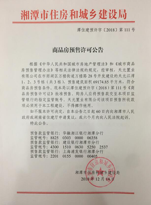 經(jīng)審核,天元置業(yè)有限公司在市雨湖區(qū)萬(wàn)樓街道萬(wàn)樓路28號(hào)開發(fā)建設(shè)的天元江灣1、2、3號(hào)棟(共3棟),預(yù)售建筑面積69174.85平方米,符合商品房預(yù)售條件。現(xiàn)湘潭市住建局以潭住建預(yù)許字(2018)第111號(hào)《商品房預(yù)售許可證》批準(zhǔn)預(yù)售。