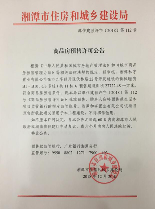 經(jīng)審核,湘潭和宇置業(yè)有限公司在市九華經(jīng)開區(qū)伏林路22號開發(fā)建設(shè)的新城璟雋B1-B10、G3號棟(共11棟),預(yù)售建筑面積27722.48平方米,符合商品房預(yù)售條件,F(xiàn)湘潭市住建局以潭住建預(yù)許字(2018)第112號《商品房預(yù)售許可證》批準預(yù)售。