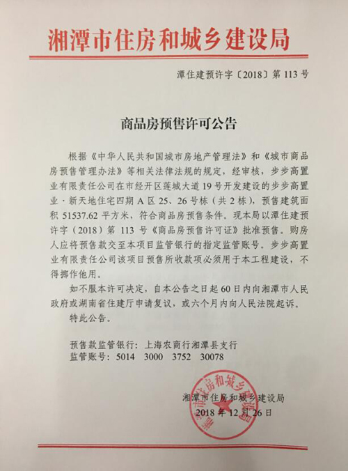 經(jīng)審核,步步高置業(yè)有限責(zé)任公司在市經(jīng)開區(qū)蓮城大道19號開發(fā)建設(shè)的步步高置業(yè)·新天地住宅四期A區(qū)25、26號棟(共2棟),預(yù)售建筑面積51537.62平方米,符合商品房預(yù)售條件,F(xiàn)湘潭市住建局以潭住建預(yù)許字(2018)第113號《商品房預(yù)售許可證》批準(zhǔn)預(yù)售。