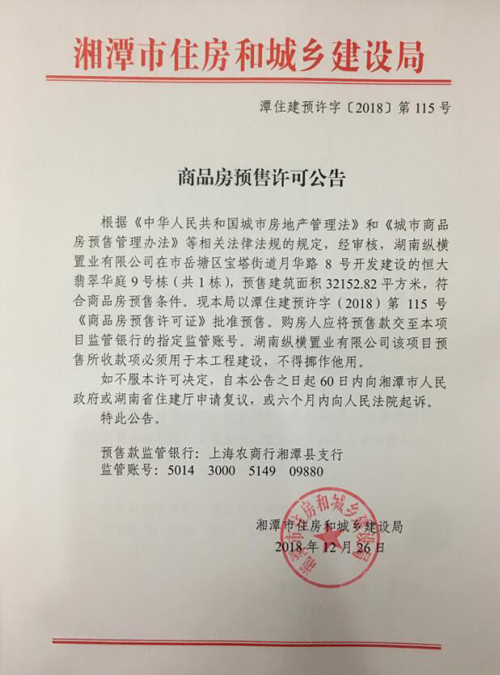 經(jīng)審核,湖南縱橫置業(yè)有限公司在市岳塘區(qū)寶塔街道月華路8號(hào)開(kāi)發(fā)建設(shè)的恒大翡翠華庭9號(hào)棟(共1棟),預(yù)售建筑面積32152.82平方米,符合商品房預(yù)售條件。現(xiàn)湘潭市住建局以潭住建預(yù)許字(2018)第115號(hào)《商品房預(yù)售許可證》批準(zhǔn)預(yù)售。 |