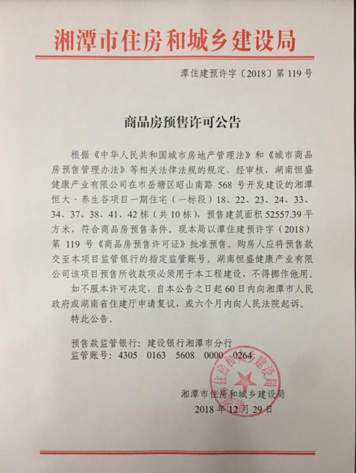 經(jīng)審核,湖南恒盛健康產(chǎn)業(yè)有限公司在市岳塘區(qū)昭山南路1號開發(fā)建設(shè)的恒大·養(yǎng)生谷項目一期住宅(一標(biāo)段)18、22、23、24、33、34、37、38、41、42棟(共10棟),預(yù)售建筑面積52557.39平方米,符合商品房預(yù)售條件,F(xiàn)湘潭市住建局以潭住建預(yù)許字(2018)第119號《商品房預(yù)售許可證》批準(zhǔn)預(yù)售。