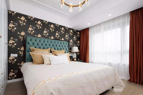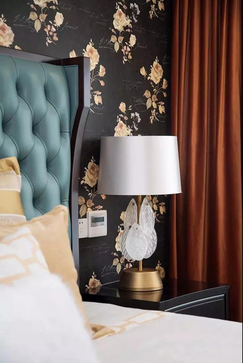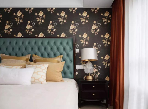 ▲ 主臥的墻面,設(shè)計(jì)師選用黑底墻紙與錯(cuò)落的花紋結(jié)合,讓臥室披上了雅致氣息。