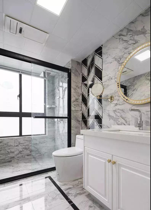 ▲ 衛(wèi)生間,大理石的自然紋理流暢而富有藝術(shù)感,與金屬元素搭配在一起,時(shí)尚又極具格調(diào)。