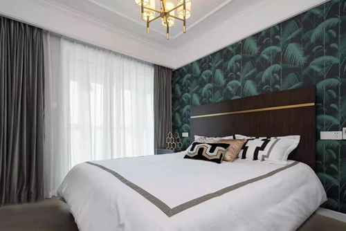 ▲ 次臥的墨綠色枝葉墻紙,使得整個(gè)空間帶有了一絲神秘感,軟裝選用黑白灰讓次臥更有氣質(zhì),整體更為時(shí)尚。