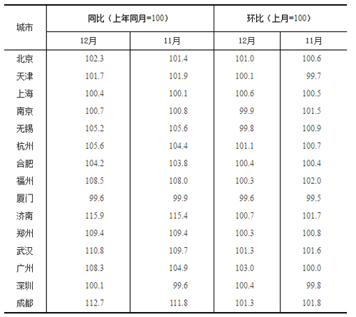 在15個熱點城市新建商品住宅銷售價格變動對比表中,濟南12月份同比上漲了15.9%,位列15個熱點城市第一。廣州12月份環(huán)比上漲了3.0%,位例15個熱點城市第一。在15個熱點城市中,廈門12月份新建商品住宅銷售價格同比下跌,廈門、深圳、天津三個城市12月份新建商品住宅銷售價格環(huán)比下跌。