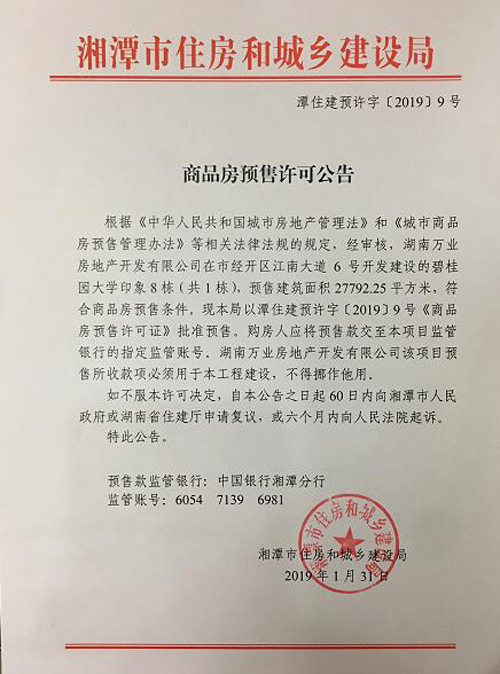 經(jīng)審核,湖南萬業(yè)地產(chǎn)開發(fā)有限公司在市經(jīng)開區(qū)江南大道6號開發(fā)建設(shè)的碧桂園大學(xué)印象8棟(共1棟),預(yù)售建筑面積27792.25平方米,符合商品房預(yù)售條件,F(xiàn)湘潭市住建局以潭住建預(yù)許字【2019】8號《商品房預(yù)售許可證》批準(zhǔn)預(yù)售。