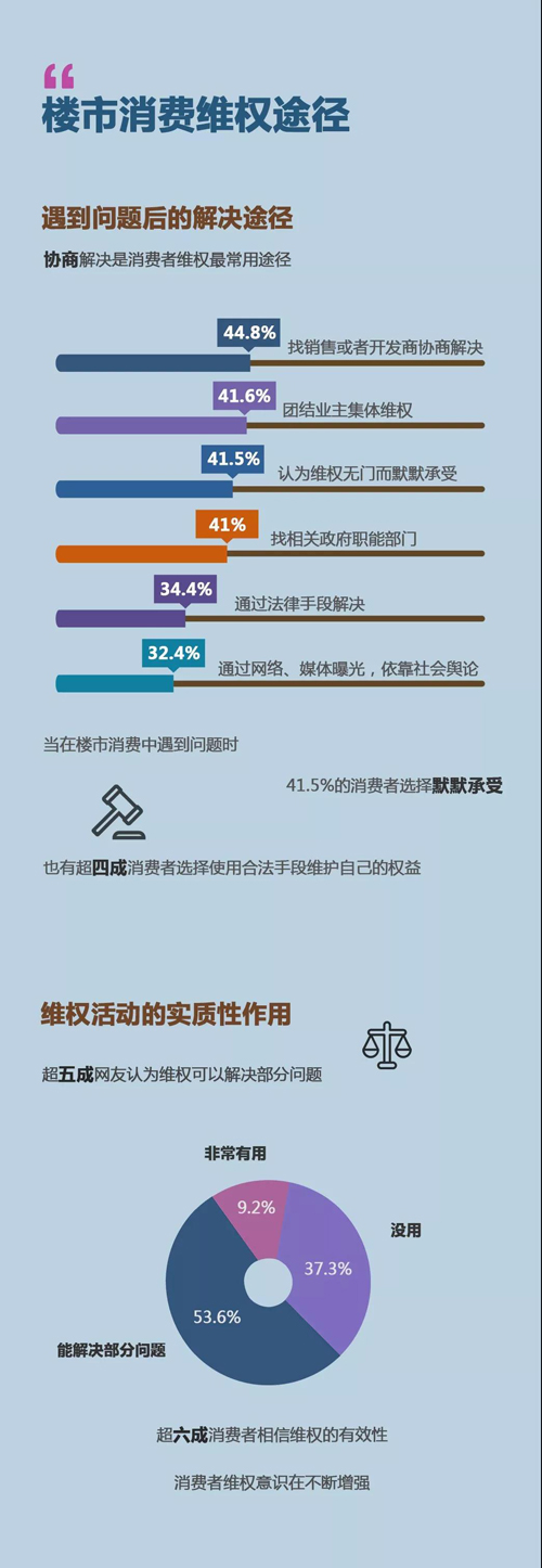 當(dāng)在樓市消費(fèi)中遇到問題時(shí),41.5%的消費(fèi)者選擇默默承受,主要原因是維權(quán)過程耗費(fèi)的人力、物力、財(cái)力讓消費(fèi)者感到吃不消、消費(fèi)者缺乏房產(chǎn)知識(shí)。但是仍有超四成消費(fèi)者選擇使用合法手段維護(hù)自己的權(quán)益。