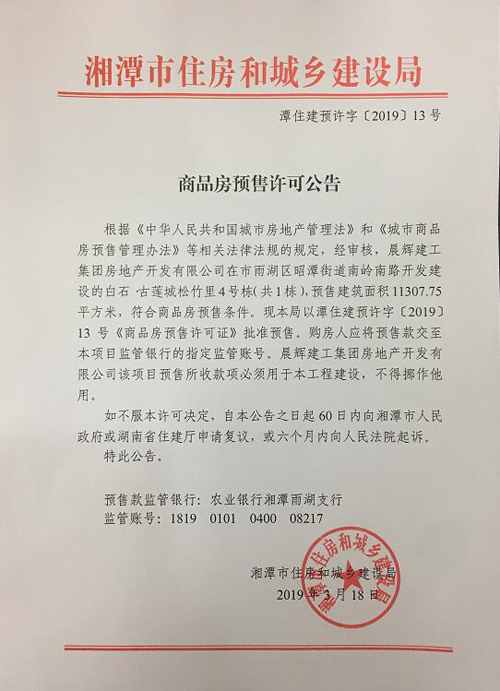 經(jīng)審核,晨輝建工集團(tuán)房地產(chǎn)開發(fā)有限公司在市雨湖區(qū)昭潭街道南嶺南路開發(fā)建設(shè)的白石·古連城松竹里4號(hào)棟(共1棟),預(yù)售建筑面積11307.75平方米,符合商品房預(yù)售條件,現(xiàn)湘潭市住建局以潭住建預(yù)許字【2019】13號(hào)《商品房預(yù)售許可證》批準(zhǔn)預(yù)售。