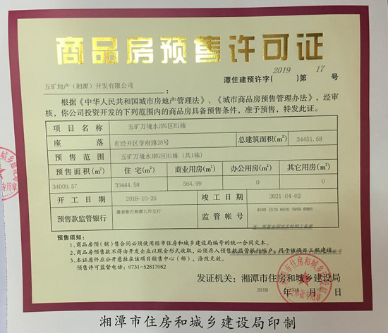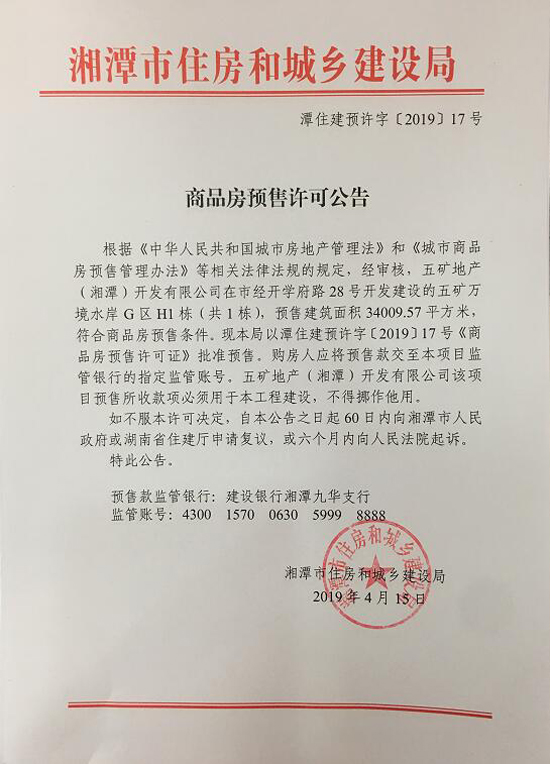 經審核,五礦地產(湘潭) 開發(fā)有限公司在市經開學府路28 號開發(fā)建設的五礦萬境水岸G區(qū)H1棟(共1棟),預售建筑面積34009.57平方米,符合商品房預售條件。現本局以潭住建預許字(2019)17號《商品房預售許可證》批準預售。