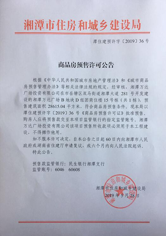 關(guān)于湘潭萬達廣場B地塊D組團商住樓15號棟(共1棟)預(yù)售許可公告
