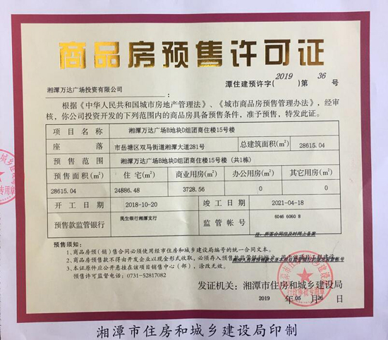 經(jīng)審核,湘潭萬達廣場投資有限公司在市岳塘區(qū)雙馬街道湘潭大道281號開發(fā)建設(shè)的湘潭萬達廣場B地塊D組團商住樓15號棟(共1棟),預(yù)售建筑面積28615.04平方米,符合商品房預(yù)售條件。