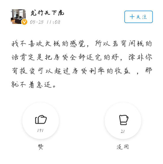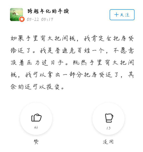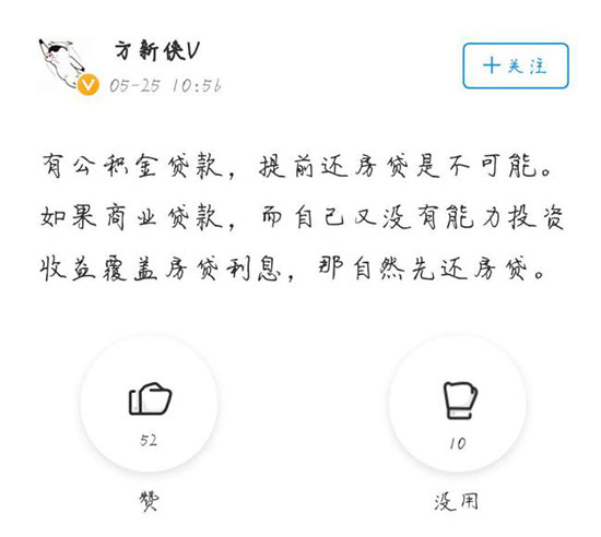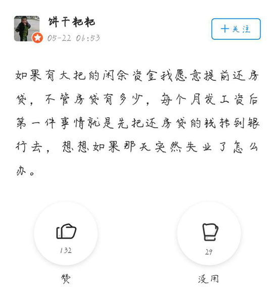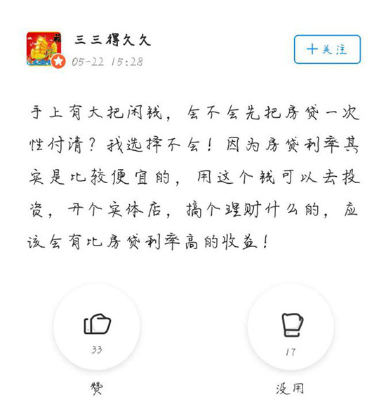 而持不愿意觀點(diǎn)的網(wǎng)友則是因?yàn)椋菏紫,房子是公積金貸款,不能提前還貸款。其次,更傾向于把閑錢拿來投資升值,創(chuàng)造更高的收益。