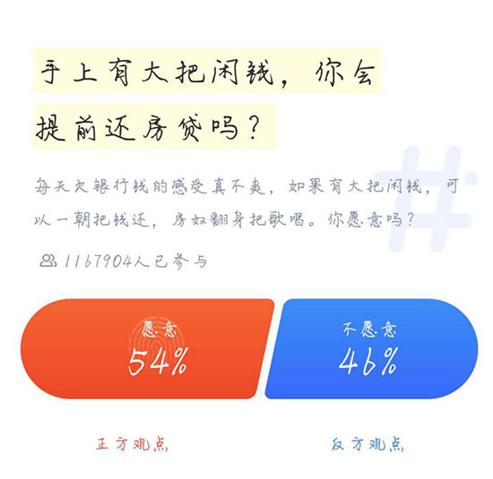 截止小編提交觀點(diǎn)后,兩種意見的比率差距不大,但是持愿意觀點(diǎn)的網(wǎng)友還是占據(jù)了多數(shù)。持這種觀點(diǎn)的網(wǎng)友大部分是因?yàn)椋菏紫,無債一身輕,沒有債務(wù)心里壓力會(huì)輕松許多。其次,并沒有好的投資方式,錢在手上會(huì)貶值,以及還有各種借錢煩惱。