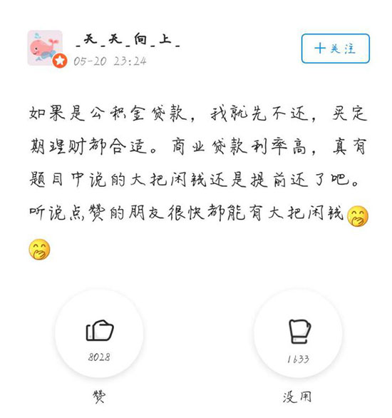 湘潭房產(chǎn)網(wǎng)6月9日訊 最近小編逛支付寶的時(shí)候,無意中發(fā)現(xiàn)了一個(gè)話題的熱度很高,那就是“手上有大把閑錢,你會(huì)提前還房貸嗎?”。說實(shí)話,對(duì)于一個(gè)沒房的人,思考這個(gè)問題有點(diǎn)不合實(shí)際,但是這個(gè)問題的前提讓小編很感興趣,所以,小編也加入了討論大軍。