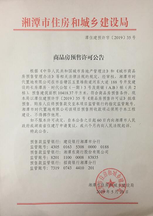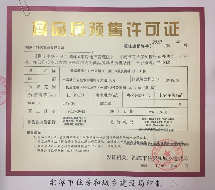 經(jīng)審核,湘潭市時代置地有限公司在市岳塘區(qū)五里堆街道河東大道188號開發(fā)建設的長房潭房,時代公館(一期)3號及商鋪(A.B)棟(共2棟),預售建筑面積10418.37平方米,符合商品房預售條件,F(xiàn)本局以潭住建預許字[2019]35號《商品房預售許可證》批準