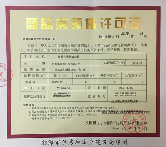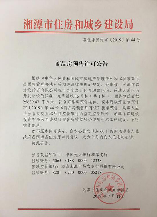 經(jīng)審核,湘潭祥霖建設(shè)投資有限公司在市九華經(jīng)開區(qū)開源路以南,蓮城大道以西開發(fā)建設(shè)的祥霖·九華新城15號棟(共1棟),預(yù)售建筑面積25639.47平方米,符合商品房預(yù)售條件,現(xiàn)本局以潭住建預(yù)許字[2019]第44號《商品房預(yù)售許可證》批準(zhǔn)預(yù)售。