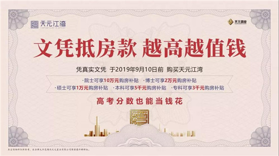 為了讓更多的高素質(zhì)人才可以融入到天元置業(yè)這個大家庭里,從現(xiàn)在開始,到2019年9月10日前,全國所有?埔陨蠈W(xué)歷的人才,購買天元江灣的高品質(zhì)住宅,都可以享受3千-10萬元的購房補貼。其中,院士可享10萬元購房補貼,博士可享2萬元購房補貼,碩士可享1萬元購房補貼,本科可享5千元購房補貼,專科可享3千元購房補貼。