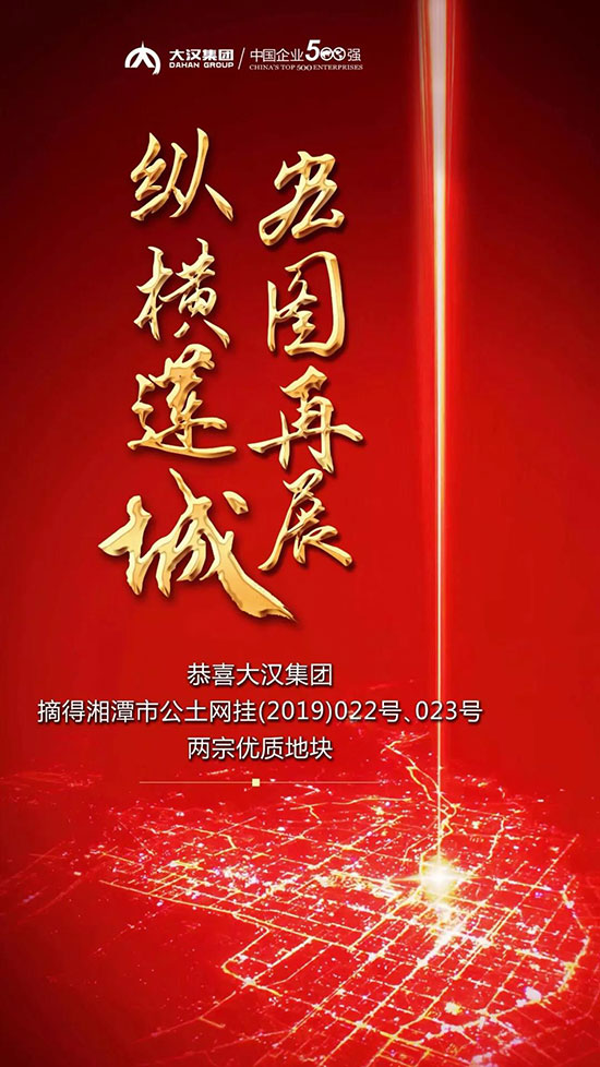 2019年,繼湘潭縣大漢·紫敬龍城后,大漢集團(tuán)再續(xù)輝煌,摘得湘潭市2019【022號(hào)、023號(hào)】?jī)勺趦?yōu)質(zhì)地塊——大漢·龍雲(yún)臺(tái),為湘潭續(xù)寫(xiě)人居標(biāo)桿!