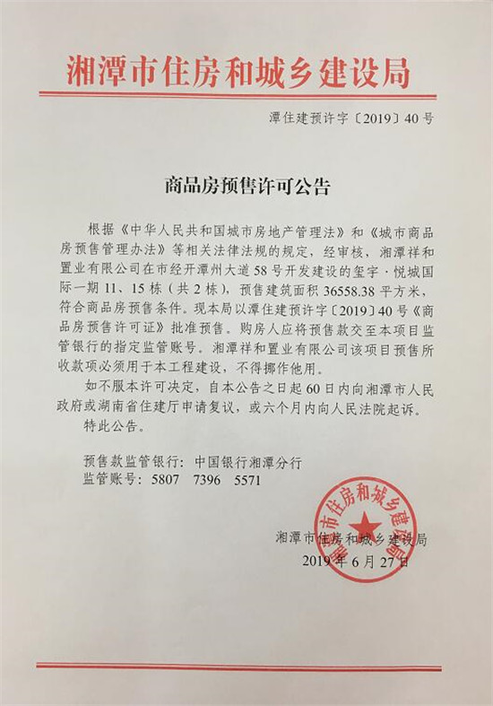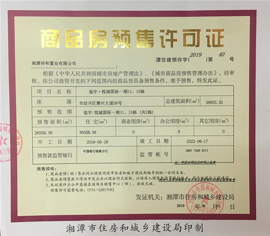 經(jīng)審核,湘潭祥和置業(yè)有限公司在市經(jīng)開區(qū)潭州大道58號開發(fā)建設(shè)的璽宇·悅城國際一期11棟、15棟(共2棟),預(yù)售建筑面積36558.38平方米,符合商品房預(yù)售條件,現(xiàn)本局以潭住建預(yù)許字[2019]第40號《商品房預(yù)售許可證》批準預(yù)售。