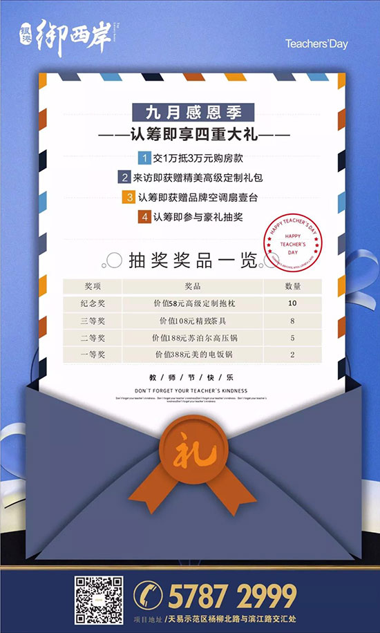 凡在9月10之前,連續(xù)三日轉(zhuǎn)發(fā)銀港·御西岸教師節(jié)活動鏈接至朋友圈三日,每日一次,憑教師資格證,即可領(lǐng)取雙重禮包: