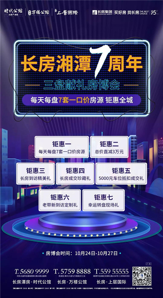 10月24日-10月27日,值此房博會盛典,不負一城厚愛,長房湘潭與城市臻情相融,將精心建筑的三個品質(zhì)樓盤——長房潭房·時代公館、長房·萬樓公館與長房·上層國際,設于房博會A區(qū)13、14號展位,鉅惠全城。