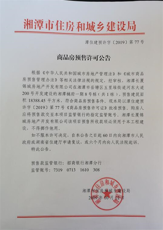 關(guān)于湘潭樾府一期8號(hào)棟(共1棟)預(yù)售許可公告
