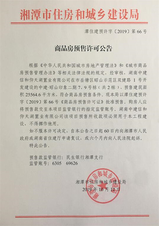 經(jīng)審核,湖南中建信和仰天湖置業(yè)有限公司在市岳麓區(qū)昭山示范區(qū)雙健路1號開發(fā)建設的中建·昭山印象二期7、9號棟(共2棟),預售建筑面積25564.6平方米,符合商品房預售條件,現(xiàn)本局以潭住建預許字【2019】第66號《商品房預售許可證》批準預售。