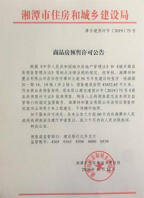 經(jīng)審核,湘潭祥和置業(yè)有限公司在市經(jīng)開潭州大道58號開發(fā)建設(shè)的璽宇·悅城國際一期18、19棟(共2棟),預(yù)售建筑面積43852.65平方米,符合商品房預(yù)售條件,現(xiàn)本局以潭住建預(yù)許字【2019】73號《商品房預(yù)售許可證》批準(zhǔn)預(yù)售
