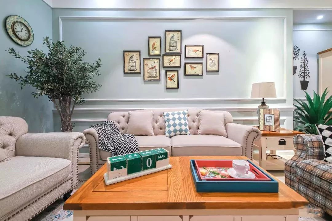 灰藍色的背景墻,帶有格子的布藝沙發(fā),做舊的桌子,墻上掛著的各式動物的掛畫,加上最吸引人眼球的綠色植株,整體顏色搭配起來,讓人非常舒服,也將美式田園自然、舒適的感覺呈現(xiàn)的淋漓盡致。