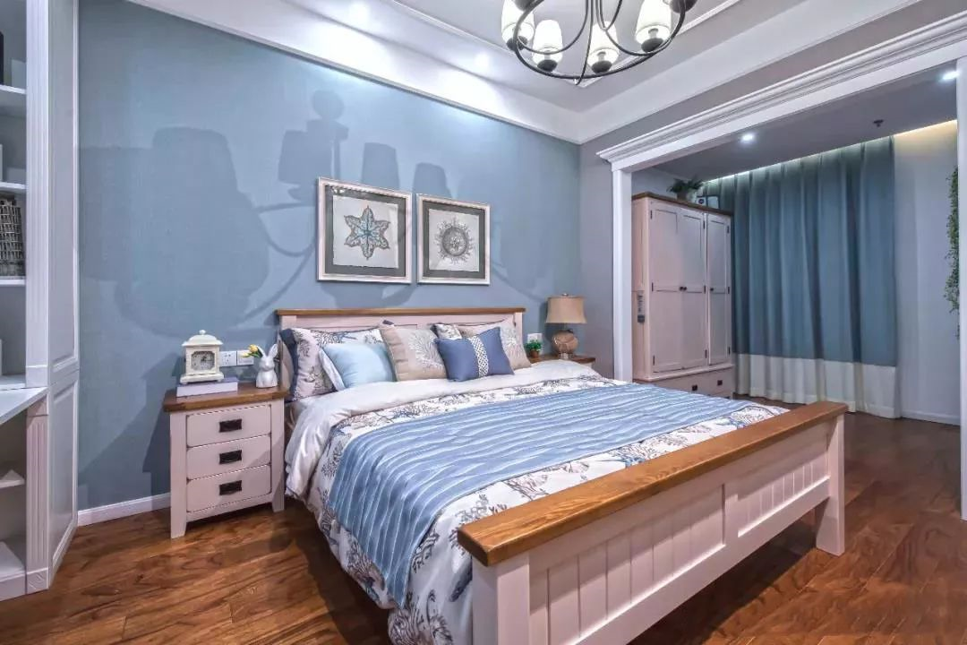 將書房和臥室合二為一,整個空間也變得更加開闊。在顏色搭配上,與美式田園風(fēng)保持一致,以灰藍色為主,讓人無論是睡覺還是工作,都會感到舒適和放松。而且閑暇時光,坐在榻榻米上,泡一杯茶或者捧一本書,也是非常愜意的一件事。