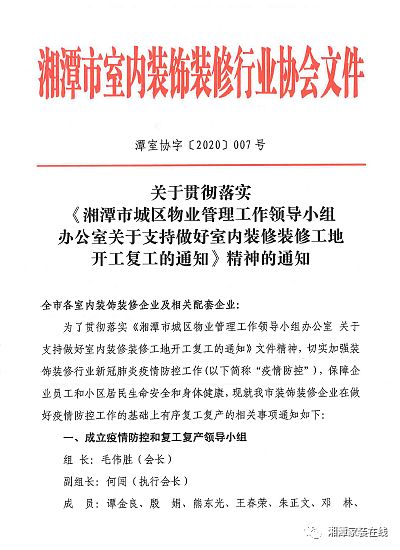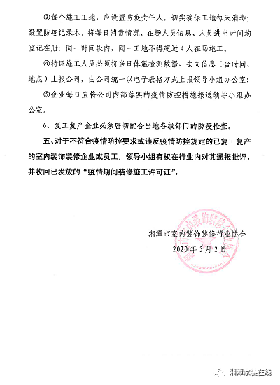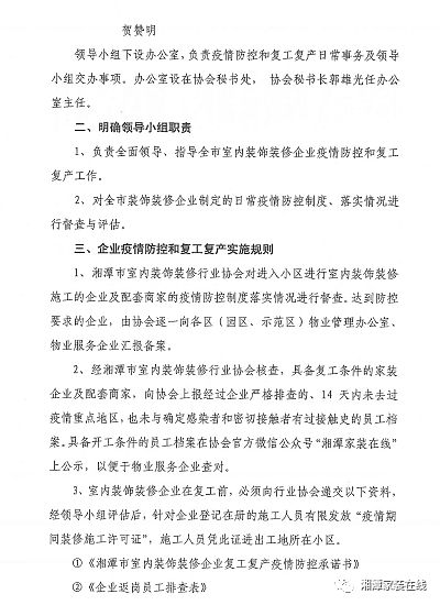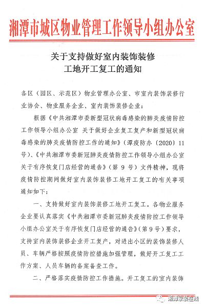 3、具備復(fù)工條件的企業(yè)由協(xié)會(huì)在“湘潭家裝在線”上公示,以便于物業(yè)服務(wù)企業(yè)查實(shí)。