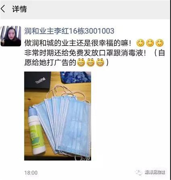 湘潭潤和城秉承集團(tuán)公司的指示,全力抗疫。自3月1日復(fù)工以來,不僅對營銷中心現(xiàn)場每天進(jìn)行全面殺毒之外,還采購了一大批口罩及消毒液免費派發(fā)給業(yè)主,廣大客戶和業(yè)主紛紛為之叫好!