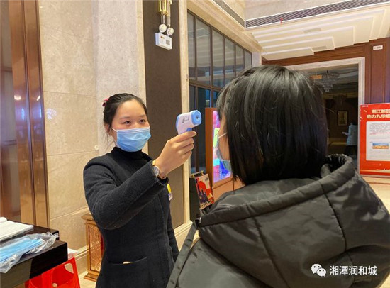 工作人員為前來領(lǐng)口罩的業(yè)主、前來看房的客戶測量體溫。
