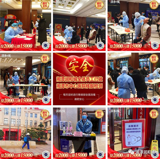 不僅如此,潤和城還邀請了湘潭市中心醫(yī)院組織全體員工進(jìn)行核酸檢測,且公司人員均通過檢測,無一感染者。疫情當(dāng)下,潤和城最大努力地保證員工有一個健康的工作場所、客戶有一個安全的看房環(huán)境。