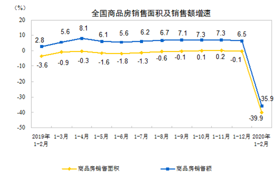 1—2月份,商品房銷售面積8475萬平方米,同比下降39.9%。其中,住宅銷售面積下降39.2%,辦公樓銷售面積下降48.4%,商業(yè)營業(yè)用房銷售面積下降46.0%。商品房銷售額8203億元,下降35.9%。其中,住宅銷售額下降34.7%,辦公樓銷售額下降40.6%,商業(yè)營業(yè)用房銷售額下降46.0%。