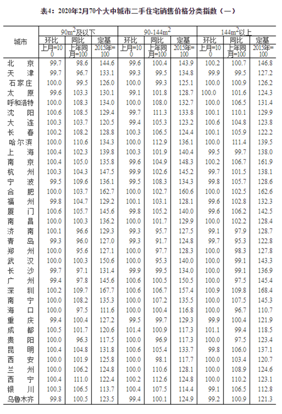 初步測(cè)算,2月份,4個(gè)一線城市新建商品住宅銷售價(jià)格環(huán)比持平,上月為上漲0.4%。其中,北京上漲0.1%,上海和深圳持平,廣州下降0.1%。二手住宅銷售價(jià)格環(huán)比上漲0.2%,漲幅比上月回落0.3個(gè)百分點(diǎn)。其中,北京和廣州分別下降0.2%和0.1%,上海和深圳分別上漲0.2%和0.5%。31個(gè)二線城市新建商品住宅銷售價(jià)格環(huán)比微漲0.1%,漲幅比上月回落0.1個(gè)百分點(diǎn),武漢、石家莊和太原等12個(gè)城市受疫情影響無(wú)成交,價(jià)格視為沒(méi)有變動(dòng)(環(huán)比指數(shù)為100,下同)。二手住宅銷售價(jià)格環(huán)比持平,與上月相同,武漢、石家莊和呼和浩特等12個(gè)城市無(wú)成交。35個(gè)三線城市新建商品住宅銷售價(jià)格環(huán)比微漲0.1%,漲幅比上月回落0.3個(gè)百分點(diǎn),揚(yáng)州、蚌埠和平頂山等7個(gè)城市無(wú)成交。二手住宅銷售價(jià)格環(huán)比由上月上漲0.2%轉(zhuǎn)為下降0.1%,包頭、錦州和揚(yáng)州等12個(gè)城市無(wú)成交。