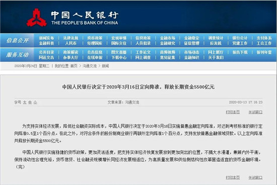 3月16日,中國人民銀行實施普惠金融定向降準(zhǔn),對達(dá)到考核標(biāo)準(zhǔn)的銀行定向降準(zhǔn)0.5至1個百分點。在此之外,對符合條件的股份制商業(yè)銀行再額外定向降準(zhǔn)1個百分點,支持發(fā)放普惠金融領(lǐng)域貸款。以上定向降準(zhǔn)共釋放長期資金5500億元。