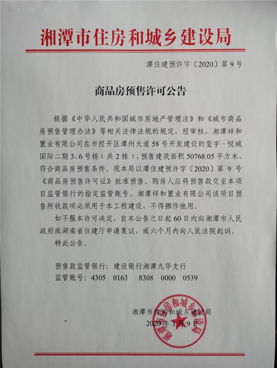 經(jīng)審核,湘潭祥和置業(yè)有限公司在市經(jīng)開區(qū)潭州大道58號開發(fā)建設的璽宇·悅城國際二期3、6號棟(共2棟),預售建筑面積50768.05平方米,符合商品房預售條件,現(xiàn)本局以潭住建預許字【2020】第9號《商品房預售許可證》批準預售。
