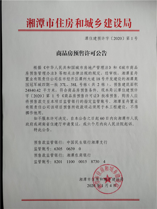 經(jīng)審核,湘潭星舟置業(yè)有限責(zé)任公司在市經(jīng)開區(qū)潭州大道18號開發(fā)建設(shè)的湘潭奧園冠軍城四期一批37L、38L號棟(共2棟),預(yù)售建筑面積24840.42平方米,符合商品房預(yù)售條件,現(xiàn)本局以潭住建預(yù)許字【2020】第1號《商品房預(yù)售許可證》批準(zhǔn)預(yù)售。
