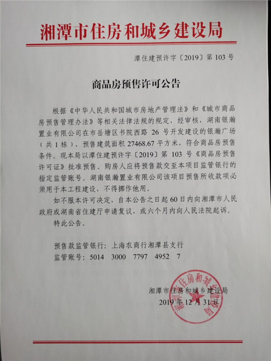經(jīng)審核,湖南銀瀚置業(yè)有限公司在市岳塘區(qū)書院西路26號開發(fā)建設(shè)的銀瀚廣場(共1棟),預(yù)售建筑面積27468.67平方米,符合商品房預(yù)售條件,現(xiàn)本局以潭住建預(yù)許字【2019】第103號《商品房預(yù)售許可證》批準(zhǔn)預(yù)售。