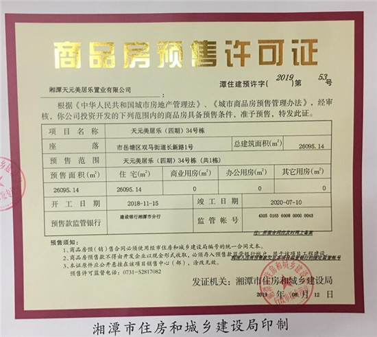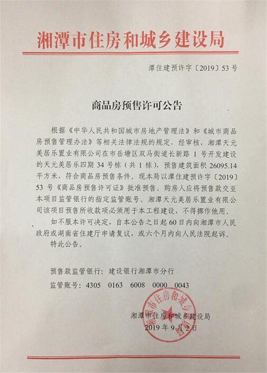 經(jīng)審核,湘潭天元美居樂置業(yè)有限公司在市岳塘區(qū)雙馬街道長新路1號開發(fā)建設(shè)的天元美居樂四期34號棟(共1棟),預(yù)售面積26095.14平方米,符合商品房預(yù)售條件,現(xiàn)本局以潭住建預(yù)許字【2019】53號《商品房預(yù)售許可證》批準(zhǔn)預(yù)售。