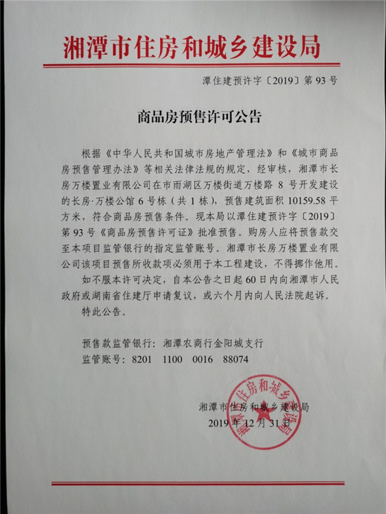 經(jīng)審核,湘潭市長(zhǎng)房萬(wàn)樓置業(yè)有限公司在市雨湖區(qū)萬(wàn)樓街道萬(wàn)樓路8號(hào)開(kāi)發(fā)建設(shè)的長(zhǎng)房·萬(wàn)樓公館6號(hào)棟(共1棟),預(yù)售建筑面積10159.58平方米,符合商品房預(yù)售條件,現(xiàn)本局以潭住建預(yù)許字【2019】93號(hào)《商品房預(yù)售許可證》批準(zhǔn)預(yù)售。
