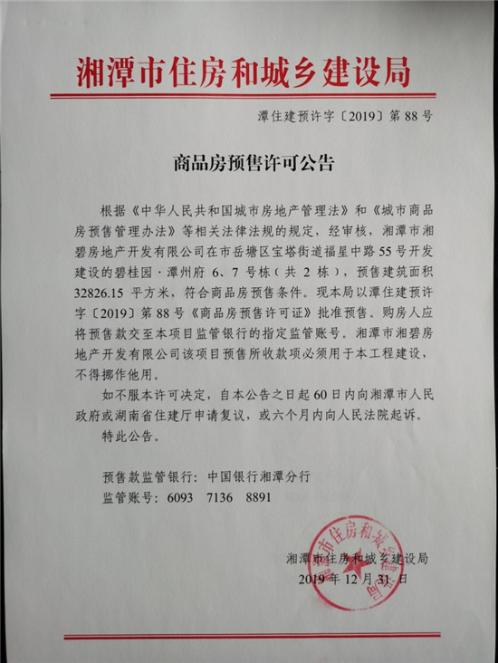 經(jīng)審核,湘潭市湘碧房地產(chǎn)開發(fā)有限公司在市岳塘區(qū)寶塔街道福星中路55號開發(fā)建設(shè)的碧桂園·潭州府6、7號棟(共2)棟,預(yù)售建筑面積32826.15平方米,符合商品房預(yù)售條件,現(xiàn)本局以潭住建預(yù)許字【2019】88號《商品房預(yù)售許可證》批準(zhǔn)預(yù)售。