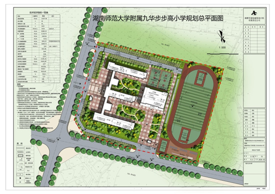 項目由步步高置業(yè)有限公司出資捐建,位于湘潭九華觀湘路與廉溪路交叉口東北角,總用地面積31837.48㎡(47.76畝),用地性質(zhì)為中小學校用地,設(shè)計班額36班,可提供1620個學位,學校總建筑面積14685.34㎡,包括教學樓、藝體樓及門衛(wèi)室等建筑;運動場地有300m環(huán)形跑道1個、足球場1個、籃球場3個(含藝體樓室內(nèi)籃球場1個)、排球場3個。規(guī)劃將教學區(qū)和校園步行主入口臨觀湘路布置,運動區(qū)位于東側(cè),教學區(qū)建筑采用串聯(lián)式布局,三棟教學樓坐北朝南,并通過連廊連通,實用便捷。校內(nèi)設(shè)環(huán)形車道,臨田徑場一側(cè)車道為應急通行車道,平時職工車輛進出通過觀湘路出入口,教學活動區(qū)域?qū)崿F(xiàn)人車分流;整體新建停車位108個,非機動車位156個。校園布局、停車位、消防車道等配套設(shè)施均滿足相關(guān)規(guī)范要求。
