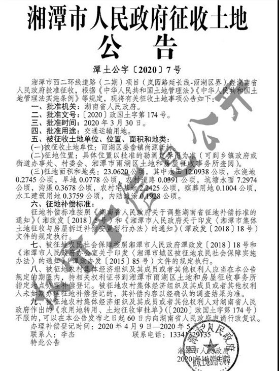 湘潭市西二環(huán)線道路(二期)項(xiàng)目(嵐園路延長(zhǎng)線-雨湖區(qū)界)征收土地公告潭土公字(2020)7號(hào)