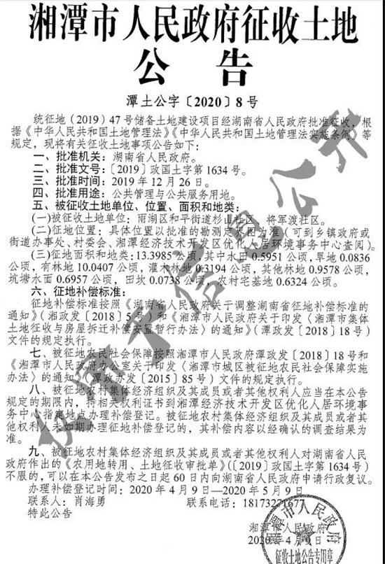 統(tǒng)征地(2019)47號(hào)儲(chǔ)備土地建設(shè)項(xiàng)目征收土地公告潭土公字(2020)8號(hào)