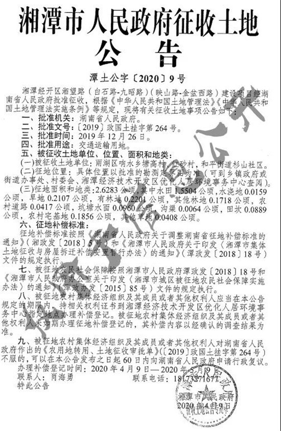 湘潭經(jīng)開區(qū)湘望路(白石路-九昭路)(映山路-金盆西路)建設(shè)項(xiàng)目征收土地公告潭土公字(2020)9號(hào)