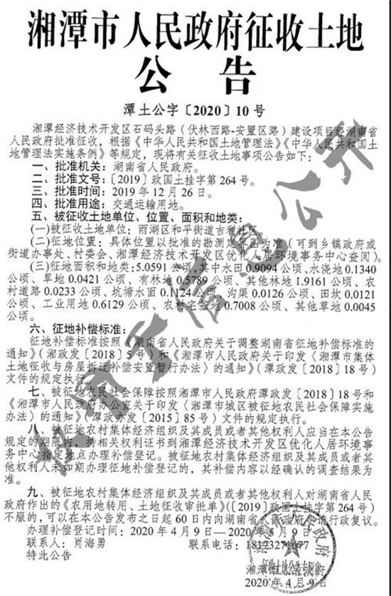 湘潭經(jīng)濟(jì)技術(shù)開發(fā)區(qū)石碼頭路(伏林西路-安置區(qū)路)建設(shè)項(xiàng)目征收土地公告潭土公字(2020)10號(hào)