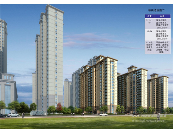 2.建筑立面和色調(diào)與已建部分保持協(xié)調(diào),建筑裙房采用干掛咖啡色花崗巖,主樓與純住宅樓采用淺米色面磚。